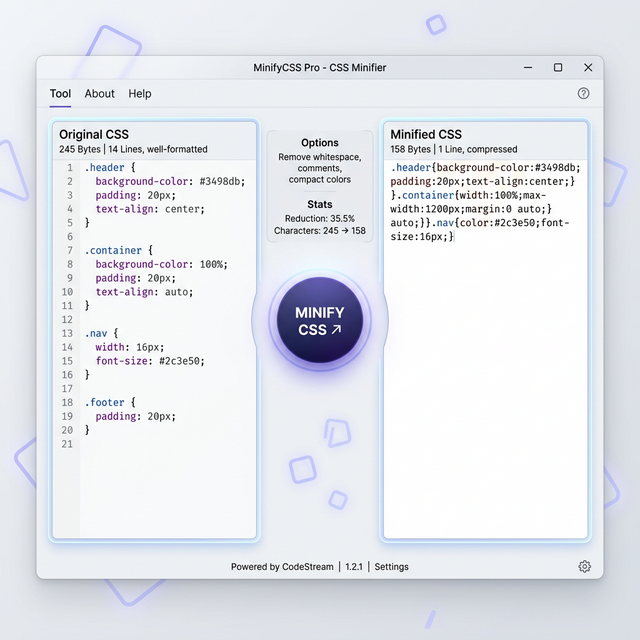 The CSS Minifier Tool is a fast, reliable, and user-friendly utility designed to help web developers optimize their stylesheets. By removing unnecessary whitespace, comments, and formatting, you can significantly reduce file size.