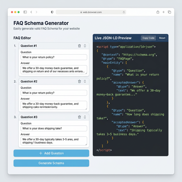 The FAQ Schema Generator Tool is a powerful utility designed to help website owners and SEO professionals create structured FAQ data. By generating valid JSON-LD, this tool enables you to enhance your site's visibility and increase the likelihood of appearing as rich results.