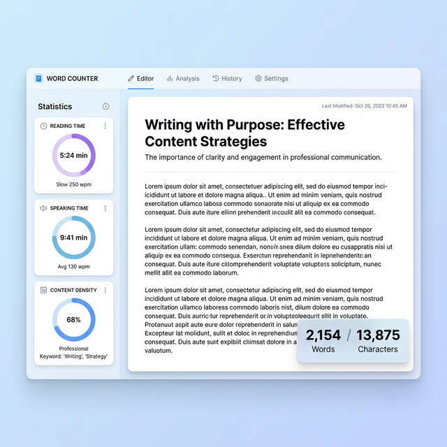 Our Word Counter Tool is much more than a simple counter. It provides a real-time, comprehensive breakdown of your content's structure, including detailed metrics for words, characters, sentences, and paragraphs.